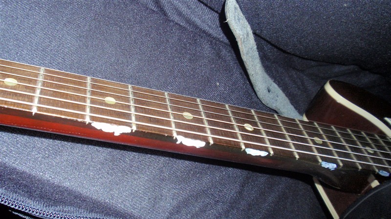 ちょっとネックが太いのと、ネックサイドのポジションマークがないのが、ちと辛い。娘の白いマニュキュアでポジションのシルシを付けてみた。