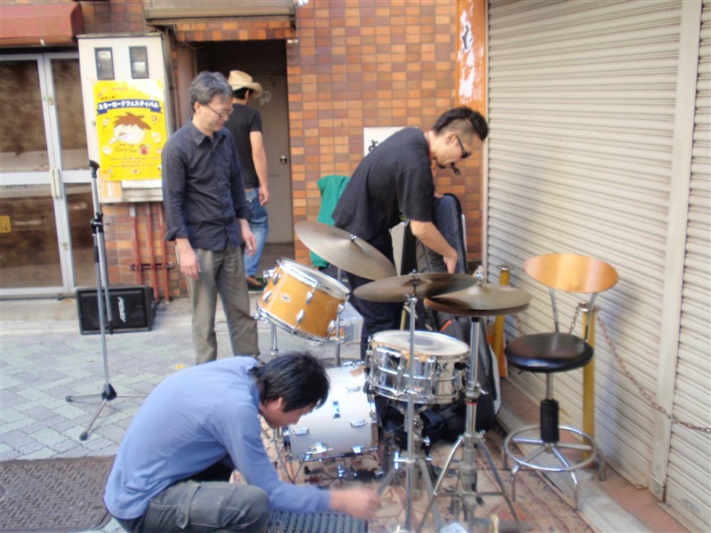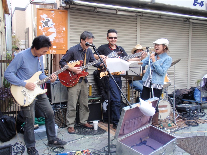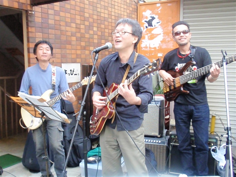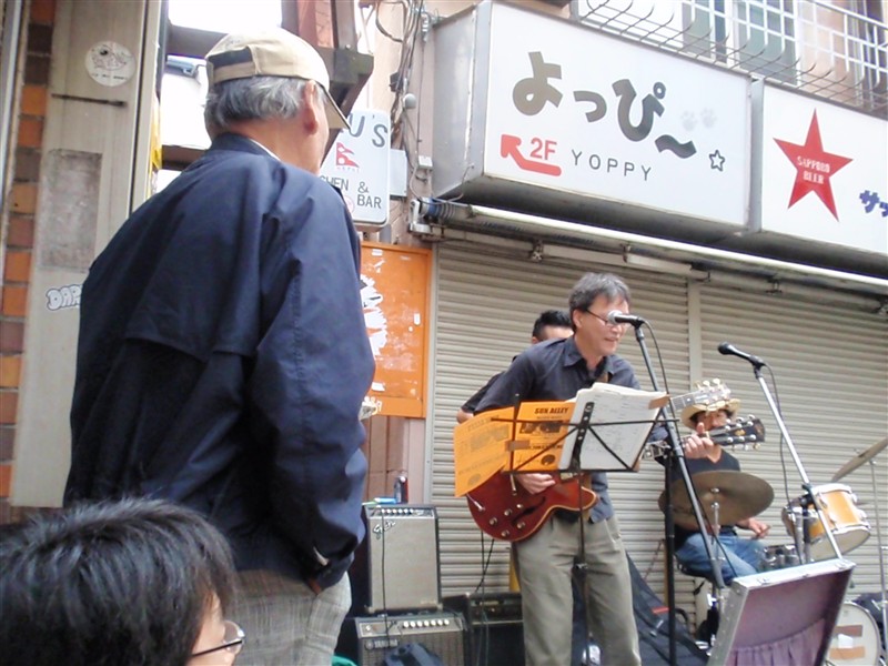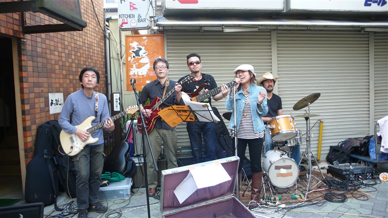 スターロード突き当りの、酒屋前特設ステージのメインは、小安田憲司さんを筆頭に、Shine-A-Lites の木村聡さん、Sun Alley などで活躍の売れっ子ベーシスト 江口弘史さん、ドラムは阿佐ヶ谷界隈のライブではお馴染みの 小田智昭さん。