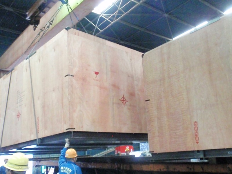 広い広~い梱包工場の中で、木枠に梱包された貨物をトレーラーのシャーシに積む。