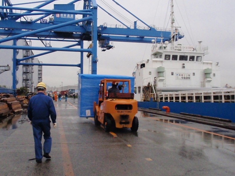 (これは別の貨物をフォークリフトで艀へ移動している様子)
