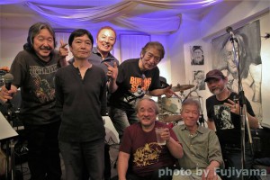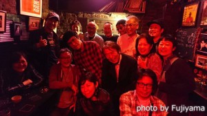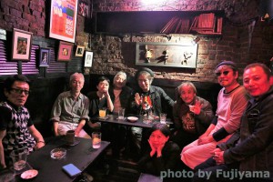 左から中根さん、永井隆さん、菊田俊介さん、妹尾みえさん、入道さん、小安田憲司さん、わたし、近藤房之助さん。手前の後姿はkotezちゃん。