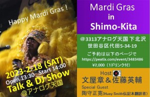 そんな折、ライターの文屋章さん、佐藤英輔さんが今年のマルディグラ3日前の2月18日に、ここでニューオリンズに特化したDJ&トークショーを行うとの情報をゲット!