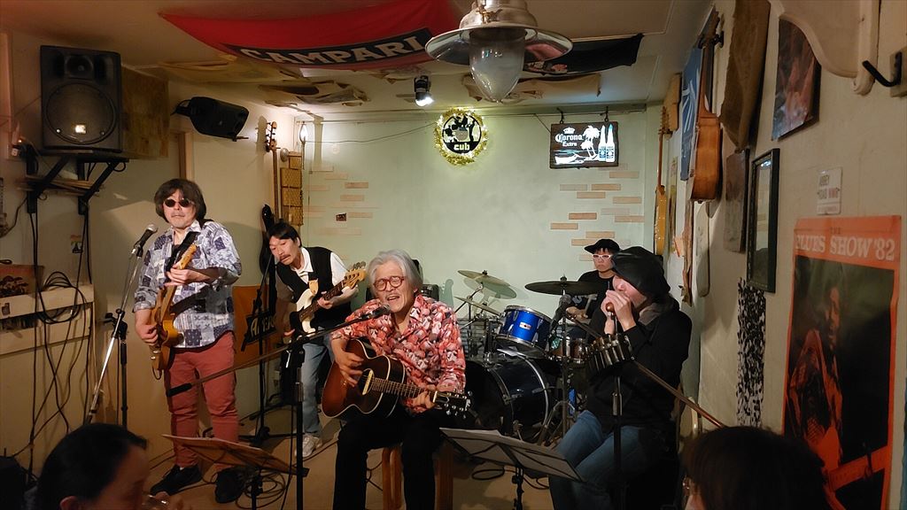 安定の山室さん、充実の小出さん、後ろからフロントの表情を覗き込むもっちゃん(笑)、二三夫ちゃんは喉が不調で唄わず、ちと心配です。