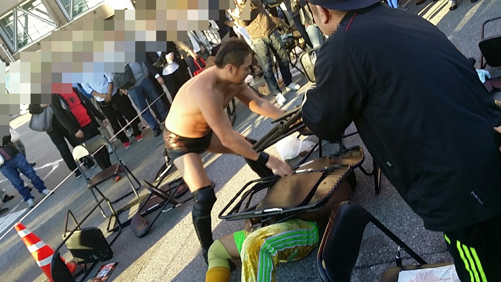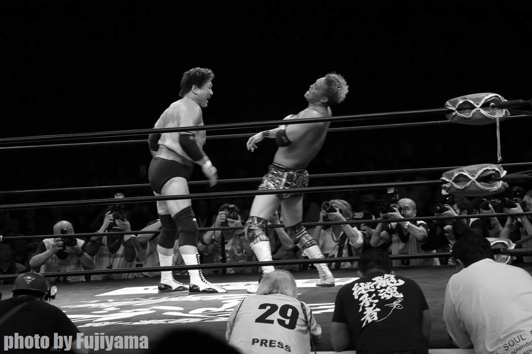 昨年に続き、試合を終えたばかりの日高郁人選手、西口プロレスのアントニオ小猪木選手と昨年同様に遭遇!
